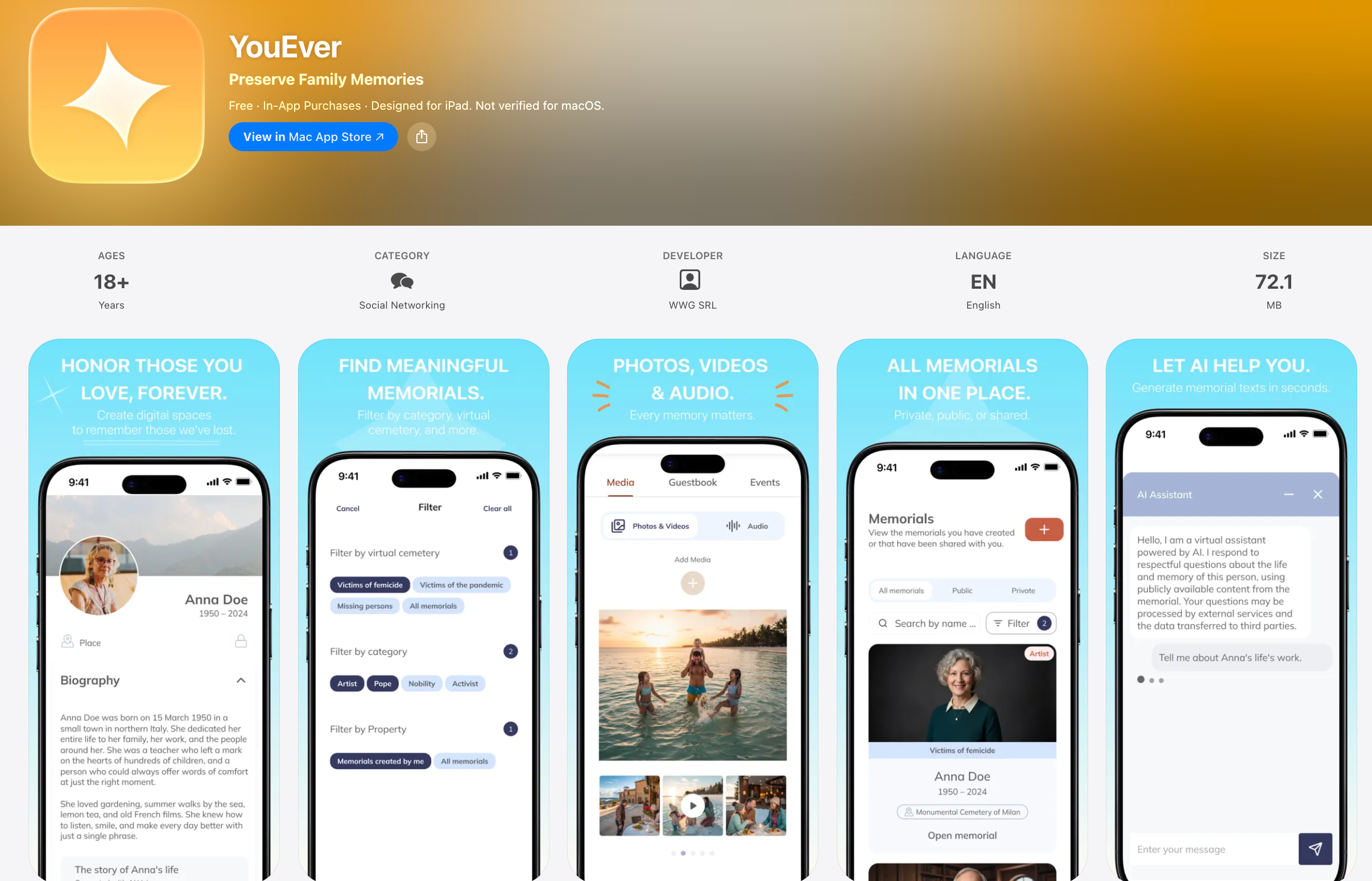 У складі команди hозроблено додаток та відповідну платформу для європейського ринку. Додаток для публікації пам’ятних дописів про людей.